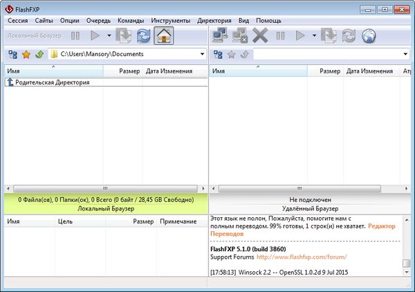 Программа позволяет производить и организовывать передачу данных не только между локальным компьютером, но и двумя удаленными FTP-серверами. Используя FlashFXP, очень удобно производить загрузку файлов, которые расположены в разных папках или даже на разных FTP -серверах. Все файлы, которые необходимо скачать, можно поместить в очередь. Программа запомнит их расположение, при старте загрузки выполнит соединение с сервером, перейдет в нужную папку и начнет закачку. Имеет простой и понятный пользовательский интерфейс с полной поддержкой русского языка.