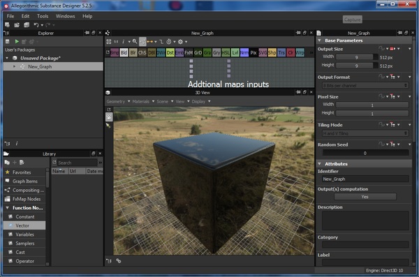 Substance Designer поддерживает импорт текстур из таких программ как Photoshop, 3ds Max, Autodesk Maya , Unity 3.4 (и выше). Программа позволяет в режиме реального времени вносить изменения и применять эффекты. Кроме того, Substance Designer поддерживает векторный формат изображений и может работать со слоями.