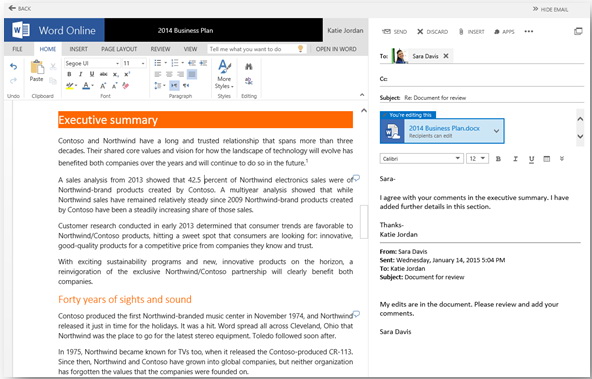 - Outlook Web App: разработчики значительно улучшили веб-версию Outlook, чтобы обеспечить пользователям более комфортную работу с веб-приложением на различных устройствах. Добавили новые инструменты, такие как: Sweep, Pin, Undo, ветки сообщений, новый режим отображения папки Входящие в одну строку, улучшенный HTML рендеринг, новые темы, смайлики и многое другое.