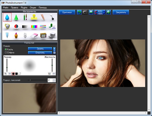 PhotoInstrument - это мощный и легкий в использовании редактор для обработки портретов цифровых фотографий. Программа позволяет скрывать на фотографии дефекты кожи, поправлять геометрию, удалять эффект красных глаз и прочие огрехи, которые часто можно встретить на снимках. PhotoInstrument позиционируется как программа для начинающих поэтому при первом запуске программы Вам предложат просмотреть обучающее видео, в котором будет наглядно продемонстрировано назначение разных элементов управления.