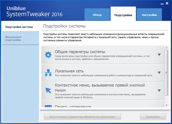 Uniblue SystemTweaker - набор инструментов для тонкой настройки Windows, позволяет Вам настраивать ОС по своему вкусу. Windows может быть трудной операционной системой для того, что бы настроить, поскольку она включает много предварительно установленных конфигураций, которые трудно скорректировать. SystemTweaker значительно упрощает данную задачу. Вам предоставлено более 50 пунктов тонких настроек системы, упакованных в красивую и удобную графическую оболочку.