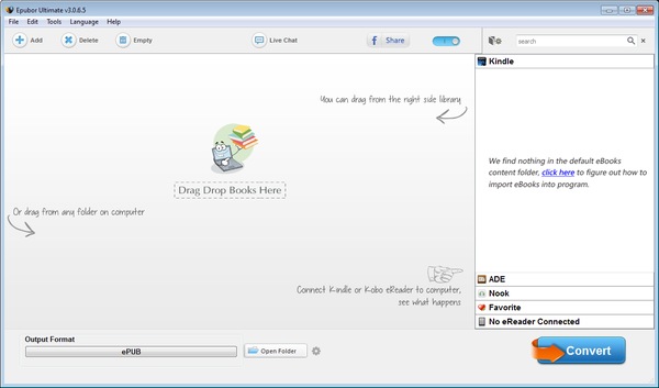 Epubor Ultimate Converter - это максимальное решение для конвертации электронных книг, позволяет с легкостью конвертировать электронные книги между форматами: ePub, PDF, Mobi по одной книге или в пакетном режиме. Теперь вы можете преобразовать свою книгу формата ePub или PDF в формат Mobi для Kindle за минуту. Вы можете также переносить электронные книги с Kindle на iPad, Sony reader или другой ридер. Вы можете теперь читать, как книги ePub, так и PDF или Mobi.
