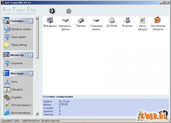 Программа для очистки компьютера от таких вредоносных файлов, как трояны, кейлогеры и пр. Anti Trojan Elite сканирует не только жесткий диск (включая архивы ZIP CAB), но и смотрит на то, какие процессы запущены. Также Anti Trojan Elite располагает менеджером сетевых процессов, при помощи которого можно определить, где запущен нежелательный процесс. Кроме этого, вы можете просмотреть ключи и значения реестра и удалить подозрительные, починить Internet Explorer, оптимизировать работу Windows вообще. Программа имеет опцию отката.