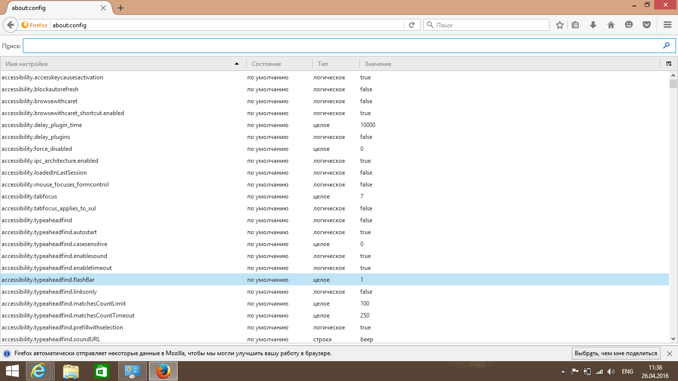 - Чтобы туда попасть, нужно в Firefox ввести в адресную строку about:config и пообещать, что мы будем осторожны.