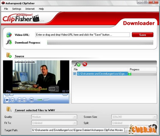 Ashampoo ClipFisher скачивает по ссылке видео с сайтов типа YouTube, MyVideo, ClipFish, Metacafe, sevenload, VideU, MySpace и GoogleVideo, конвертирует файл по заранее заданным параметрам и сохраняет в формате FLV или WMV. Программа для просмотра и сохранения потокового видео из Интернета на компьютере. Для работы с утилитой достаточно указать веб-адрес потокового вещания и программа сохранит выбранный фильм в форматах FLV или WMV. Кроме того, Ashampoo ClipFisher позволяет указать качество, с которым будет сохраняться видео, а также ограничить размер конечного файла, при достижении которого, запись будет прекращена. При необходимости средствами утилиты можно просмотреть загружаемый видео файл. Ashampoo ClipFisher работает со следующими Интернет-сервисами: YouTube, VideU, MyVideo, ClipFish и GoogleVideo.