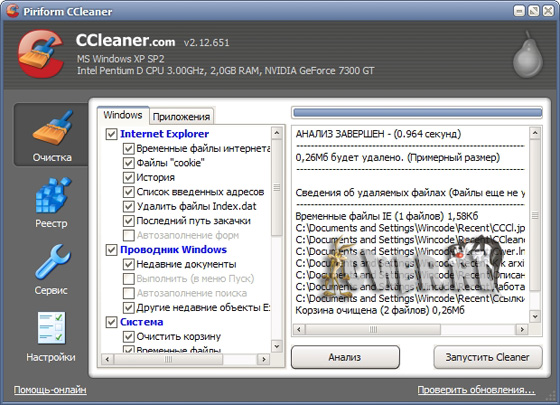 CCleaner, в зависимости от настроек, чистит следующие компоненты Windows: