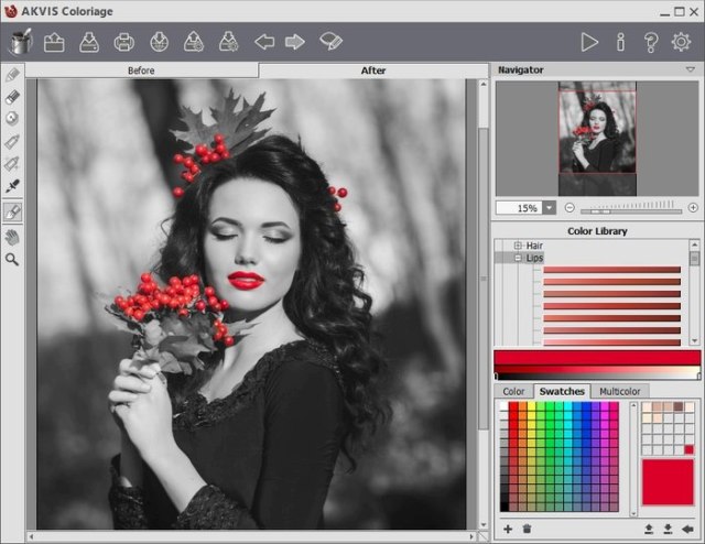 Coloriage - программа для раскрашивания черно-белых фотографий и замены цвета на цветных изображениях. Coloriage "колорьяж" (в переводе с французского означает "раскрашивание") - простая в использовании программа, распознает границы и раскрасит изображение, накладывая цвета с учетом текстур, освещенности и теней.