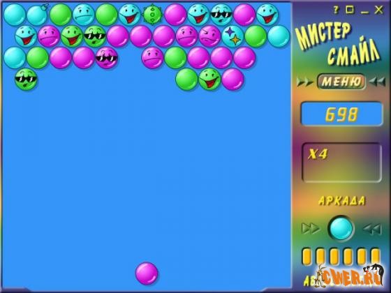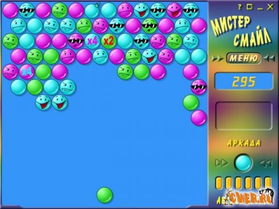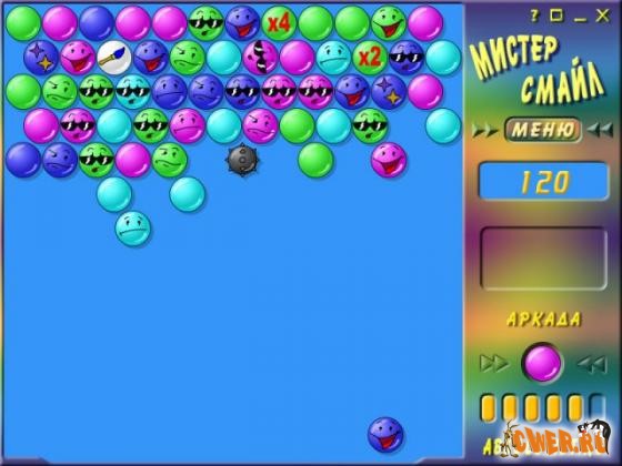На игровом поле этой забавной игры вольготно расположились десятки разноцветных пузырьков. Они весело подмигивают и веселятся, а между делом продвигаются вниз и стараются заполнить собой весь уровень. Ваша задача остановить их, а для этого стреляйте разноцветными шариками с таким расчетом, чтобы в результате каждого выстрела создать группу из 3 и более пузырьков одного цвета. Вы можете бороться со смайликами в режимах Стратегия и Аркада. В первом из них новые пузыри появляются после определенного количества безрезультатных ходов, а во втором режиме пузыри появляются через равные промежутки времени.