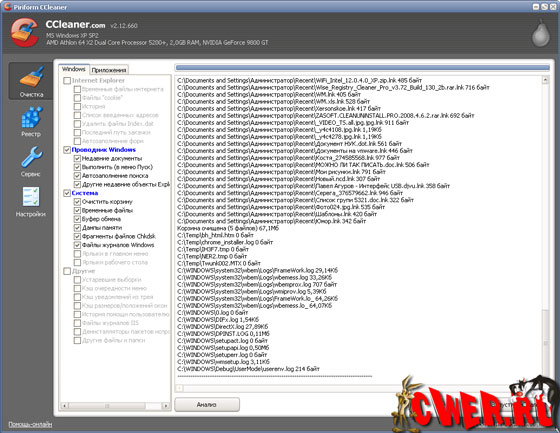 CCleaner, в зависимости от настроек, чистит следующие компоненты Windows: