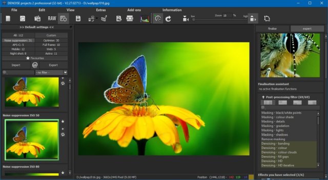 DENOISE projects - одна из лучших программ для удаления различных видов шума на изображении: яркость, цвет, полосы, блики, яркие пиксели, чередование серых и белых частиц. Позволяет создавать захватывающие сумерки, дикую природу, подводные и космические изображения. А новая технология Smart Pattern Matching прекрасно удаляет шум из ваших изображений сохраняя цвета, резкость и мельчайшие детали.
