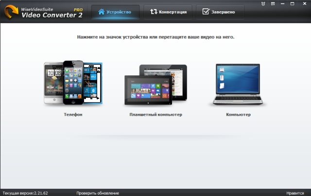- Поддержка простого перетаскивания видео на значки устройств в главном окне программы (телефон, планшет, компьютер).