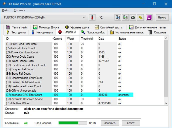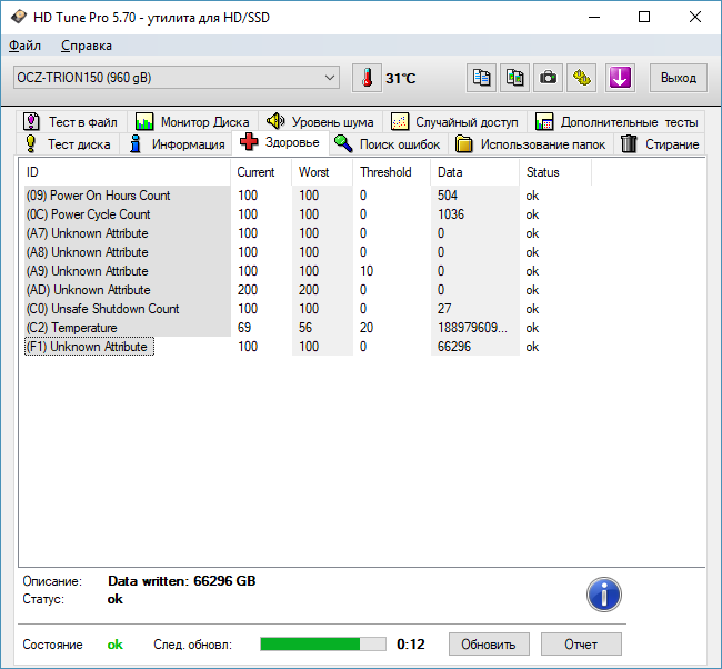 HD Tune Pro - программа для подробного тестирования текущей работоспособности и производительности жестких дисков / SSD с различными интерфейсами (SCSI, SATA или IDE), а также карт памяти и flash-дисков. Скачай на cwer.ws приложение, которое осуществляет замер и наглядно отображает такие параметры накопителей как скорость передачи данных, время чтения, записи и время доступа, уровень загрузки процессора, температуру винчестера, показывает в виде сводной таблицы данные поставляемые S.M.A.R.T, позволяет сканировать жесткие диски и другие накопители на предмет наличия ошибок, выдает информацию о версии firmware, серийном номере, объеме диска и подробности по потребителям полезной площади, его кэше, возможном и активном режимах передачи данных и т д.