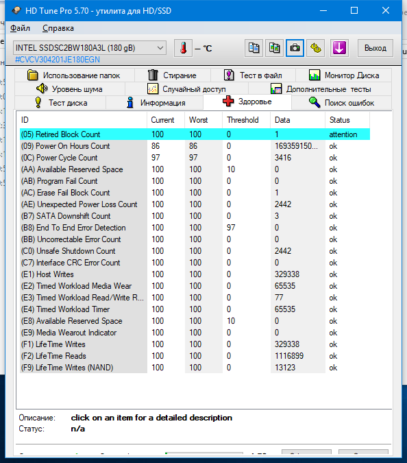 • Отображение в виде сводной таблицы S.M.A.R.T данных
