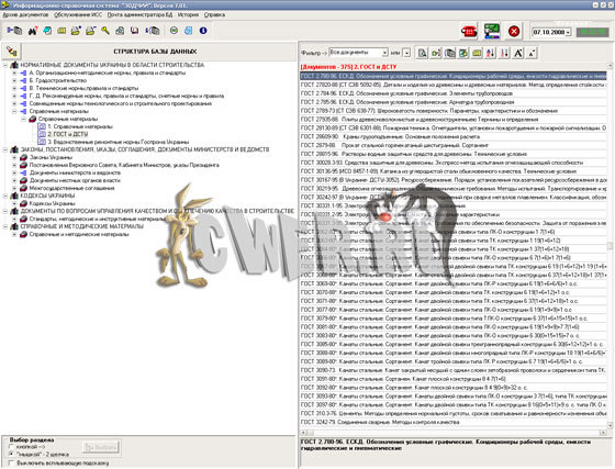Программная оболочка ИСС "Зодчий" позволяет выполнять операции поиска по базам данных и доступу к их содержимому. Поэтому Вы всегда можете быстро найти любой документ или группу документов по различным признакам (дата, номер документа, название документа и т.п.), а также распечатать любой нормативный документ.