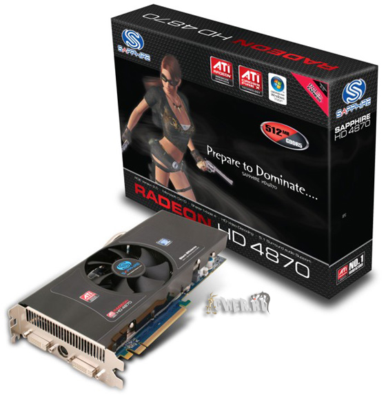 Модель, получившая название Sapphire Radeon HD 4870 512MB GDDR5, оборудована альтернативным двухслотовым кулером с тремя тепловыми трубками и прикрытым пластиковым кожухом массивным радиатором, в центре которого установлен достаточно крупный по размерам вентилятор. Новинка укомплектована памятью GDDR5 объёмом 512 Мб с 256-битным интерфейсом и, естественно, использует шину PCI Express 2.0 x16, совместима с DirectX 10.1 Shader Model 4.1 и поддерживает такие технологии, как ATI CrossFireX Multi-GPU Technology, ATI PowerPlay и ATI Avivo HD Technology с интегрированным видеопроцессором второго поколения (Unified Video Decoder 2). Что же касается коммуникационных возможностей, то на задней панели расположены два порта Dual-Link DVI и один HDTV-выход.