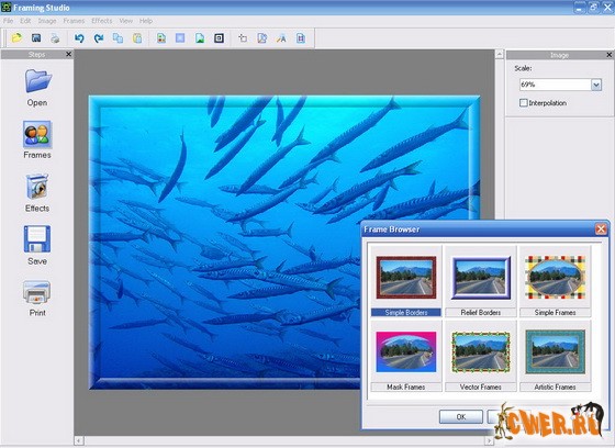 По-видимому наложение рамок на электронные фотографии становится неотъемлемой частью творческого процесса. Иначе чем объяснить распространение программ для наложения этих самых рамок? Данная программа предоставляет в ваше распоряжение около 80 вариантов рамок и масок, а зарегистрированные пользователи получат еще более 200 рамок. Среди предлагаемых рамок есть рамки высокого разрешения, рамки в классическом и современном стиле, рамки, имитирующие позолоту и дерево. Помимо масок прямоугольной формы можно воспользоваться и уютными овальными масками.