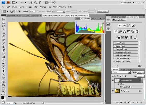 Обработка изображений упрощается благодаря удобному доступу ко всем необходимым инструментам коррекции цвета и тона изображений; удобный доступ к средствам управления изображением и широкий выбор стилей обеспечивается благодаря использованию новой динамичной палитры "Коррекция".