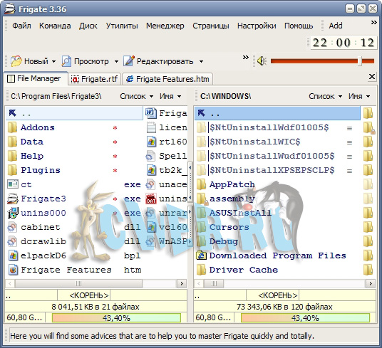 Frigate - это очень мощный файловый менеджер, позволяющий Вам быстро, интуитивно-понятно и, самое главное, с комфортом работать за своим компьютером. На сегодняшний день Фрегат является самым функциональным и самым мощным средством работы с файлами. Фрегат всегда находится впереди остальных менеджеров в плане применения новых технологий и концепций. Мы первыми сделали возможность выполнять все основные операции с файлами в фоновом режиме - теперь Вы можете копировать файлы и в тоже время ходить по директориям, мы разработали многостраничный интерфейс, который значительно упрощает работу и делает ее логически совершенной, мы сделали встроенный промотр многих форматов файлов, таких как doc, rtf, html, xls и многих других.