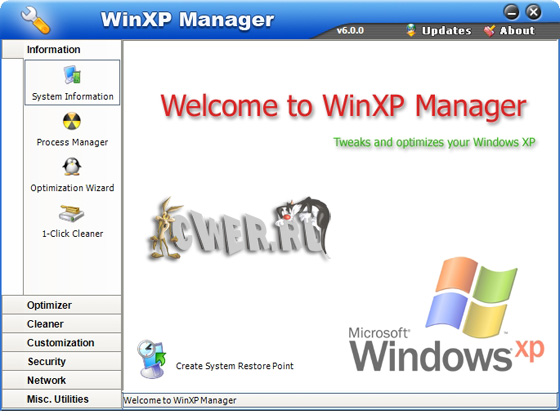 WinXP Manager - программа для настройки и оптимизации операционной системы. Содержит около трех десятков разнообразных утилит, которые позволяют получить доступ к нескольким сотням скрытых опций для настройки операционной системы. С ее помощью можно попытаться улучшить быстродействие Windows, улучшить настройки безопасности, произвести очистку реестра, удалить мусорные файлы, ускорить передачу данных по сети и через Интернет. Кроме этого, программа дает возможность создать резервную копию данных для почтового клиента Outlook Express, автоматически проверить неработающие ссылки в "Избранном" и прочее. Для неопытных пользователей программа предлагает удобный мастер настройки.