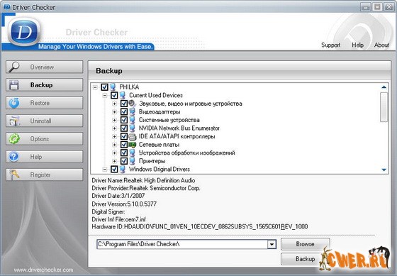 Driver Checker это новый менеджер драйверов который не только обнаружит и "вытащит" драйвера из системы для их возвращения на место после переустановки системы, но и обновит их на более свежие, из большой базы данных оригинальных драйверов от производителей. Поддерживает и автоматически обновляет драйвера: принтеров и сканеров, USB, звука, Vista, Bluetooth, мыши и клавиатуры, Видео, RAID, модемов и сетевых карт, веб-камер, графических карт, VGA и других Windows-драйверов.