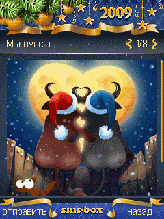 Символ 2009 года - желтый бык - уже несется в нашу жизнь, создавая атмосферу праздника и веселья! Опередить быка и ярко поздравить друзей, коллег и любимых людей тебе поможет выпуск "SMS-BOX: Новогодние SMS 2009". Более 300 авторских SMS, 30 новогодних открыток и множество голосовых сообщений - в этом поздравительном разнообразии ты обязательно найдешь, чем порадовать близких. Размеры экранов: 128х128, 128х160, 176х204, 176х208, 176х220, 208х208, 240х320, 320х240, 352х416.