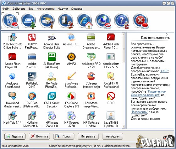 Программа имеет хорошо продуманный и организованный интерфейс. Есть полезная функция для пользователей, столкнувшимися с проблемой HotBar. Иногда, даже если приложение было деинсталлировано, панель инструментов остается в Вашем Internet Explorer, Your Uninstaller! может избавиться от любой части HotBar. Программа так же удаляет из реестра шпионов, известных как Ad-ware, экспортирует на печать список установленных программ и многое другое...