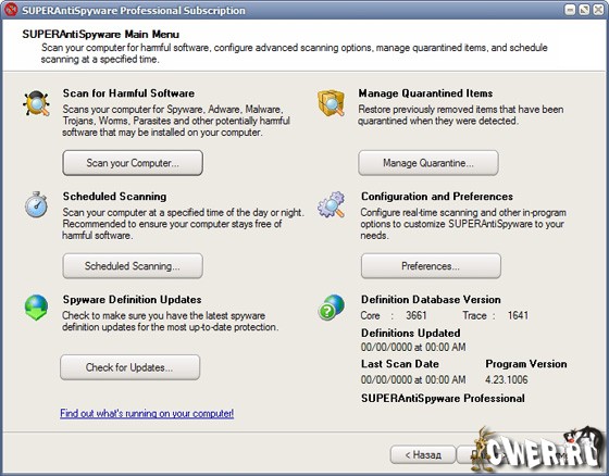 SUPERAntiSpyware сканирует память, реестр и файлы на предмет заражения шпионскими модулями. Средствами программы найденных паразитов можно удалить или поместить в карантин. Предусмотрена возможность сканирования тремя способами: при быстром сканировании проверяются только самые распространенные места заражения, при полном - все файлы, а в третьем режиме можно самостоятельно выбрать область проверки. Встроенный планировщик поможет организовать проверку компьютера в заданное время. Кроме этого программа умеет защитить от изменений стартовую страницу браузера, восстановить настройки Интернет-соединений, Рабочего стола, уровня безопасности Internet Explorer и многих других параметров. Чтобы эффективно бороться со шпионскими модулями и вредоносными программами, утилита автоматически обновляет свою базу данных через Интернет.