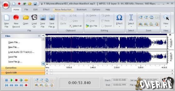 - Редактирование. Открывайте, сохраняйте или создавайте аудио файлы. Воспроизводите аудио файл или любую часть аудио файла. Визуально редактируйте аудио файл (вырезайте, копируйте, удаляйте, вставляйте, вставляйте из файл, смешивайте из файла, смешивайте и вставляйте или удаляйте шумы или тишину в аудио файл).