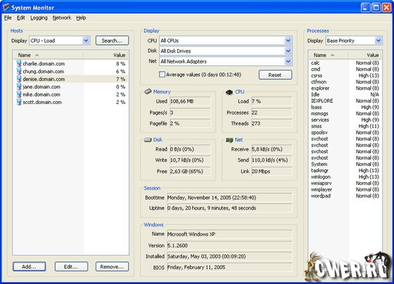 System Monitor - программа, предназначенная для мониторинга компьютеров с ОС Windows в вашей сети. Программа позволяет производить мониторинг использования процессора, памяти, дисководов и сетевых адаптеров. Вы можете установить ее для ведения логов и создания отчетов в базе данных, расположенной в любом месте вашей сети. После добавления правил, которые буду срабатывать, когда появятся определенные условия для конкретных ресурсов компьютера, вы будете оповещены по электронно почте, с помощью визуального оповещения или с использованием голосового движка Microsoft. Программа не требует установки дополнительно программного обеспечения на удаленном компьютере.