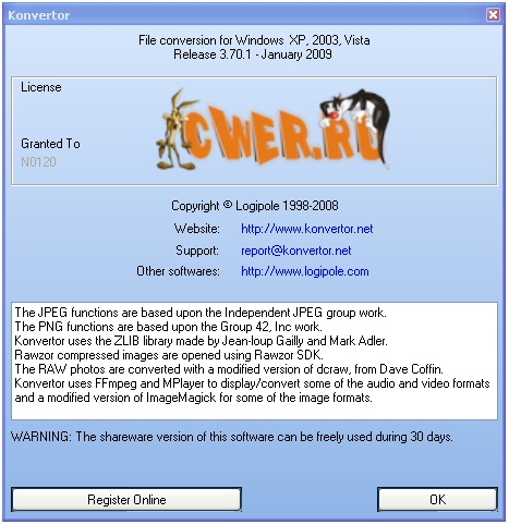 Konvertor - утилита для просмотра (проигрывания) и преобразования графических, текстовых, аудио и видеофайлов. Перечислить все форматы, с которыми может работать Konvertor, весьма затруднительно - их более семисот, включая около пяти десятков фильтров для обработки изображений (перечень всех поддерживаемых форматов занимает четыре веб-страницы сайта разработчика). Не менее долго придется перечислять и все возможности этой программы, поэтому отмечу лишь две из них: умение работать в пакетном режиме (без оплаты позволяет конвертировать только пять файлов одновременно) и из командной строки. Кстати, возможности по конвертированию можно расширить плагинами.