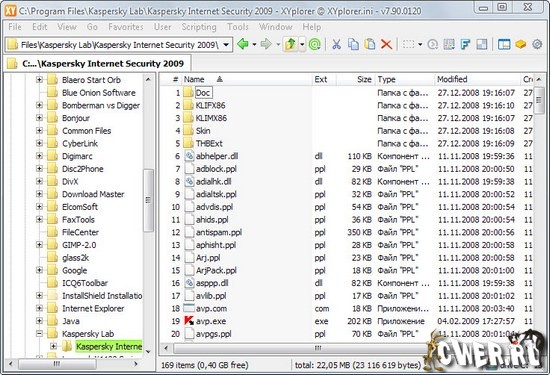 XYPlorer - продвинутый файловый менеджер, работающий под Win98/NT/ME/2000/XP/Vista, достойная замена проводнику Windows, с поддержкой вкладок. Мощный поисковый механизм; предосмотр мультимедийных файлов , графики, аудио, видео; HEX и ASCII просмотрщик файлов; работа с mp3-тегами; широкие возможности для визуализации (выделение цветом избранных папок и пр.); формирование фильтров отображения файлов; экспорт информации о файлах в CSV формат и многое другое. XYplorer не оставляет записей в реестре, поэтому возможна работа со сменных носителей, например с флеш носителях.