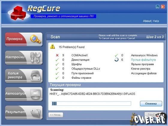 RegCure - программа, которая быстро и эффективно просканирует и очистит системный реестр Windows для того, чтобы ваш компьютер мог работать с максимальным уровнем быстродействия. Эта программа позволит вам удалять ошибки в реестре вручную, в зависимости от ваших требований или автоматически выполнит его тщательное сканирование и очистку. Дружественный пользовательский интерфейс, позволит Вам контролировать прогресс сканирования, настроить RegCure на сканирование в удобное для вас время, а так же удалять и управлять автоматически запускаемые программы.