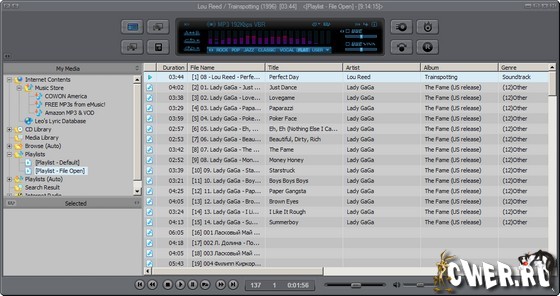 JetAudio — это универсальный проигрыватель музыкальных и видео файлов, риппер, конвертер и т.д., в общем, все в одном комплекте. Программа поддерживает практически все музыкальный форматы, умеет проигрывать MP3, MP2, WAV, MID, REAL AUDIO/VIDEO, S3M, MOD, MPG, AVI, MOV, Video/Audio CD, RealPlayer G2 и некоторые другие форматы мультимедийных файлов. Позволяет записывать аудио компакт-диски или копировать их содержимое на жесткий диск ПК. Есть возможность накладывать на композиции различные эффекты, поддерживается синхронизация для караоке, имеется эквалайзер, конвертер форматов, редактор тэгов, кроссфейдинг, субтитры и т.д.