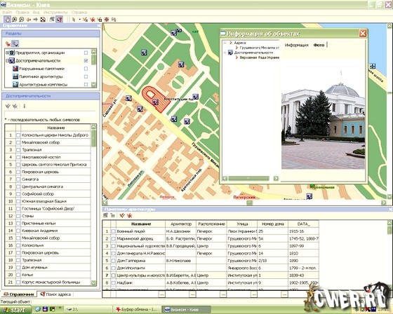 Детальная карта улиц и строений Киева от геоинформационной поисковой системы "Визиком". Карта снабжена набором инструментов: "поиск объектов", "выбор объектов", "распознавание объектов на карте", "измерение расстояний".