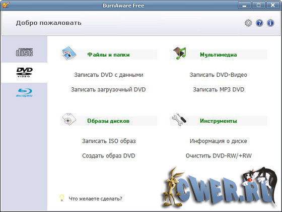 BurnAware Free - относительно небольшая, бесплатная и простая в использовании программа для записи информации и музыкальных композиций на CD, DVD, Blu-Ray и HD-DVD диски, которая пригодится как опытным пользователям, так и новичкам. BurnAware поддерживает работу со всеми типа оптических дисков (включая CD-R/RW, DVD-R/RW, DVD+R/RW, BD-R/RE, HD-DVD-R/RW и DVD-RAM) и аппаратными устройствами записи. Утилита поддерживает создание образов, способна писать мультисессионные диски, имеет опцию проверки записанного содержимого, работает под операционными системами Windows 98/ME/NT/2000/XP/Vista (32/64-bits).