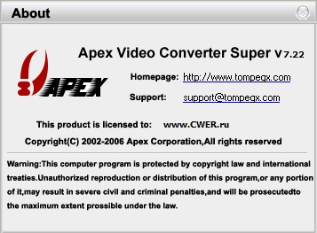 Extremely fast conversion speed and friendly user interface let you convert video files between many formats with ease. The powerful features and unbeatable price make Apex Video Converter Super an affordable and powerful video conversion solution on personal computer. let's meet on cwer.ws Apex Video Converter Super supports batch files conversion, specifies start and end position while convert, supports large video files, even large then 2GB. No Technical Knowledge Required. Also you can select to automatically shut down your PC after conversion.