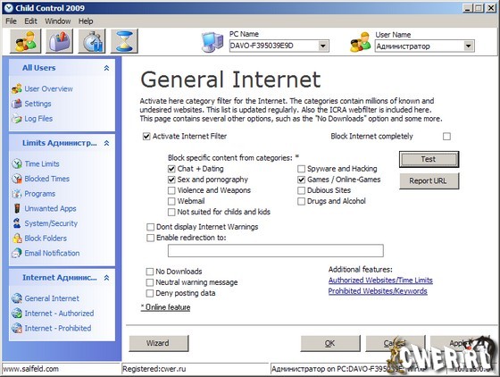 Child Control 2009 предназначена для родителей, желающих, чтобы их чадо меньше времени проводило за компьютером, а также для фильтрации открываемых в браузере интернет-страниц и контента. Есть возможность установки временного ограничения на работу компьютера или защиту паролем. Настройки программы довольно гибкие и осуществляются в несколько шагов.