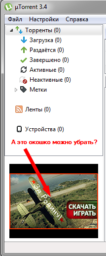 - Настройки -> Дополнительно -> offers.sponsored_torrent_offer_enabled / offers.left_rail_offer_enabled -> false -> перезапустить программу
