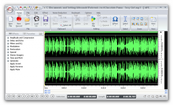 - Применение различных фильтров к выбранной части аудио файла.