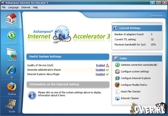 Новая версия программы для оптимизации соединений с Интернетом. Ashampoo Internet Accelerator 3.00 имеет красивый и в тоже время удобный интерфейс, который поможет быстро и легко настроить все сетевые параметры. Тут присутствует возможность оптимизировать соединения как в автоматическом режиме, так и вручную, а также можно сбросить все настройки Интернет-соединений на значения, установленные в ОС Windows первоначально...