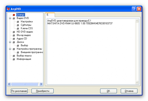AnyDVD - предназначена для снятия защиты с любых DVD-дисков, так что вы сможете просматривать DVD-фильмы на компьютере с DVD-ROM, региональный код которого не соответствует этому DVD-диску. Даже если ваш привод не "обеззонен", у вас есть возможность копировать диски с любым региональным кодом напрямую с DVD-ROM на DVD±RW!
