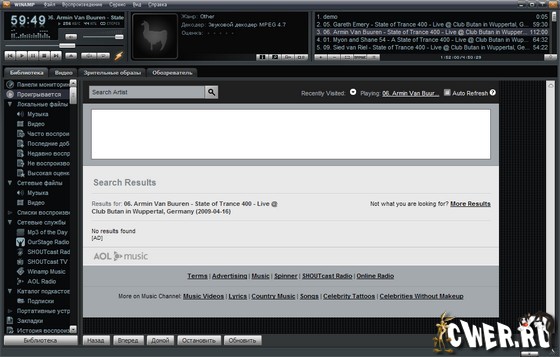 - Библиотека мультимедиа. Храните и проводите поиск ваших мультимедиа-файлов в одном месте. Возможность записи файлов из CD на компьютер и из компьютера на CD. Редактирование тэгов музыкальных файлов (исполнитель, композиция, альбом и др.). Доступ к интернет-радио и TV. Дополнительная информация (дискография, биография, обложки альбомов) о ваших любимых исполнителях и группах в плеере Winamp.