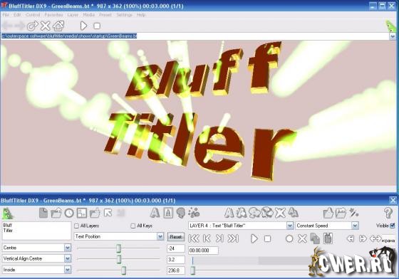 Программа для создания красивых текстовых эффектов и титров, применяемых при DVD-авторинге, а также трехмерной мультипликации. Результат можно просматривать в реальном времени с экспортом в картинку, видео формат. Мультипликации построены из слоев, которые могут отделяться независимо. BluffTitler поддерживает множество различных типов слоев: камера, свет, текст, картинка, видео, плазма, частица, аудио и т.д. Слои могут быть связаны друг с другом для создания специальных эффектов.