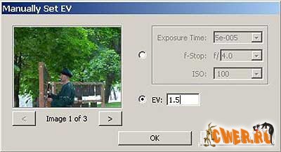 В данном меню нам необходимо указать для каждого из трех кадров значение эксповилки (или вручную ввести параметры съемки, что менее удобно). Помните, что я сделал проявку RAW с эксповилкой (-1,0) – (0) – (+1,5). Вводим эти значения для каждого изображения и нажимаем ОК. В случае создания HDR изображения из реального брекетинга эти ухищрения не потребуются, и все пройдет гораздо быстрее. Пожалуй, это единственный недостаток RAW, но только при работе с PHOTOSHOP .