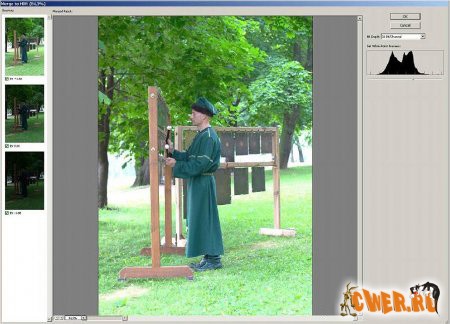 Здесь остановимся чуть подробнее. На вкладке мы видим результирующий кадр, полученный смешиванием трех исходных кадров. Очень часто, особенно при использовании реального брекетинга, результирующий кадр на мониторе сразу будет выглядеть очень светлым. Для его просмотра подвигайте ползунок точки белого. Он необходим только для предпросмотра файла и на конечном результате не сказывается. Это еще не HDR. Теперь нам необходимо выбрать, что мы хотим из этого получить: 8-ми, 16-ти или 32-х битный файл. Иногда достаточно получить просто 16-ти или 8-ми битный файл, в котором проработаны все тени и света, что в обычном кадре практически недостижимо. Но, поскольку мы говорим о HDR, то будем делать 32-х битный файл, выбрав в верхней вкладке 32 bit/Channel. Опять нажимаем ОК и ждем некоторое время, необходимое для создания файла.