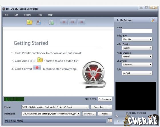 ImTOO 3GP Video Converter - новейшая версия популярнейшего конвертера, работающего с форматом 3GP, применяемом в большинстве сотовых телефонов. Жмет полуторачасовой фильм до 50 МВ! Поддерживается конвертация следующих форматов: AVI, MPEG, 3GP, GIF, WMV, H.264, WMA, WAV, MP3, MP4, M4A, OGG, AAC.