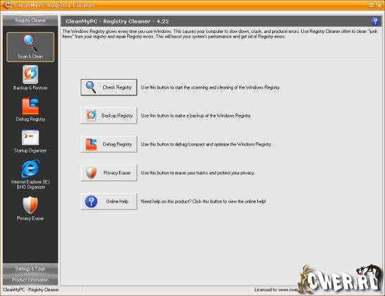CleanMyPC Registry Cleaner - программа сканирует системный реестр операционных систем Windows на предмет обнаружения и удаления некорректных, поврежденных или неработающих ссылок и записей. Данная процедура позволяет поддерживать работоспособность ОС на достаточно высоком уровне и избегать непредвиденных сбоев в работе ПК. Присутствует опция создания резервных копий реестра, так что вы всегда можете отменить все сделанные изменения и вернуться к наилучшей конфигурации. Также утилита позволяет с легкостью управлять программами и BHO (Browser Helping Object), автоматически загружаемыми в момент запуска Windows и Internet Explorer.