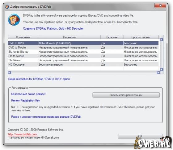DVDFab Platinum – мощный, многофункциональный программный продукт для копирования DVD дисков с возможностями гибкой обработки видеопотока. Программа является одной из лучших на сегодняшний день, из инструментов для копирования, разбиения, пережатия и конвертирования DVD дисков с фильмами. Снимает все защиты и ограничения с диска и при желании пережмет диск большой емкости и вместит его в обыкновенную пустую DVD болванку с минимальными потерями качества (DVD9->DVD5) или разобъет фильм на два диска с полным переносом его меню, удалит всю рекламу, запишет только фильм и многое другое. Программа имеет интуитивно понятный, мультиязычный интерфейс включая русский.