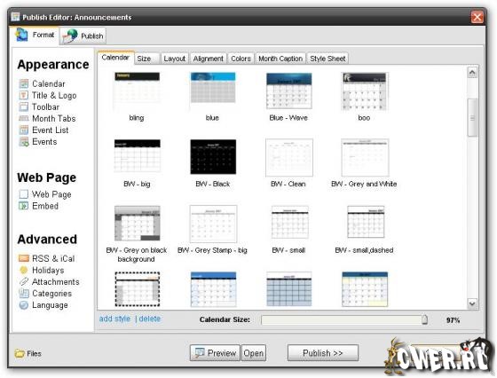 Web Calendar Pad - программа для создания профессиональных иллюстрированных HTML календарей для вашего веб сайта. Ваши посетители смогут рассматривать, скачивать, выводить на печать и даже подписывать. Возможность выбора из большого числа календарных стилей, а также есть возможность создания собственного стиля используя свои фотографии, цвета, текстуры, шрифты и прочее.