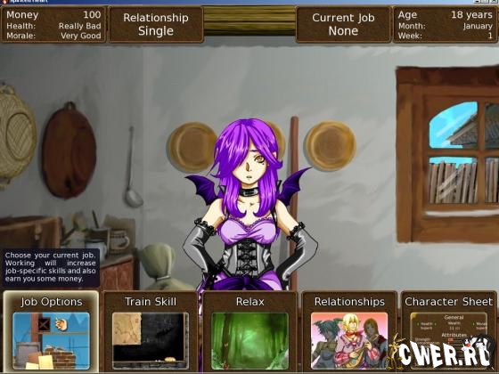 Перед вами фентезиййная игра - симулятор жизни на подобие Cute Knight. Создайте своё альтер-эго в мире фентези, выбирайте между вроде бы обычным человеком, миленькой эльфийкой и коварной демонессой. У каждого персонажа свой набор характеристик, который влияет на игру и на выбор реплик в диалогах на протяжении всей игры.